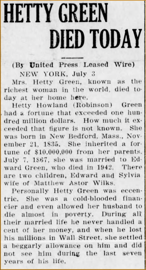 Fourteen years later, Hetty died. Her obituary was not necessarily complimentary.