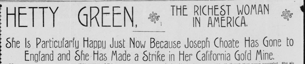 Success does often cause jealousy in others.  The fact is that Hetty invested primarily in bonds, railroads and real estate; she kept away from speculating in the stock market — especially industrial stocks. Hetty despised high risk investment. She much preferred investing in things like Fishermen’s Wharf in San Francisco. Another of her holdings was headlined in The San Francisco Call – a California gold mine.