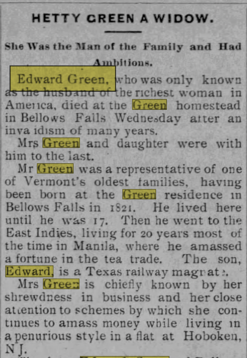 Based on newspaper reports, the death of Edward Green could not be written without mentioning his notoriety was due to being the husband of “the richest woman in America.” From this death notice it seems that one of his home State of Vermont newspapers tried to acknowledge his accomplishments.