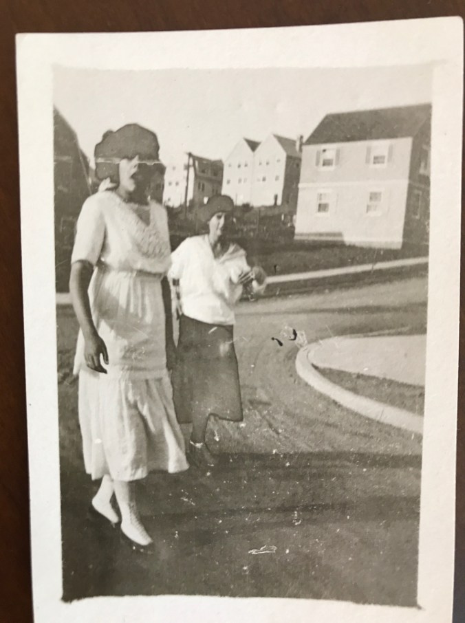 It’s difficult to tell much about when and where the photograph was taken. The girls’ hats, dresses, and shoes look like they are from the late 1910s, but they appear to be walking in a very modern-looking subdivision, complete with a roundabout.