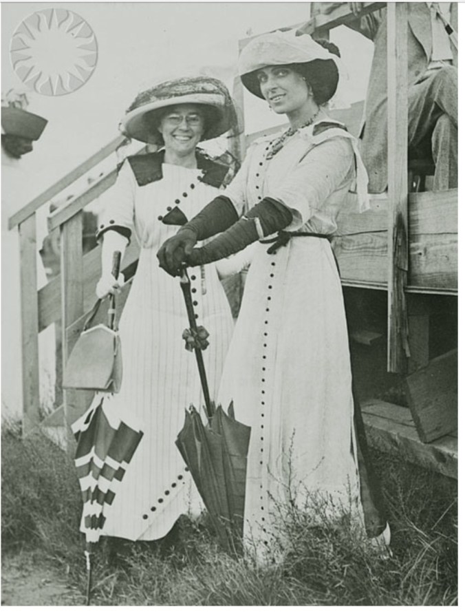 Matilde Moisant (left) poses with Harriet Quimby (right). Both are wearing long dresses and hats, Quimby is holding a dark umbrella, Moisant a purse and striped umbrella. Circa 1911-1912…Credit: Underwood & Underwood (credit: Smithsonian Institution)