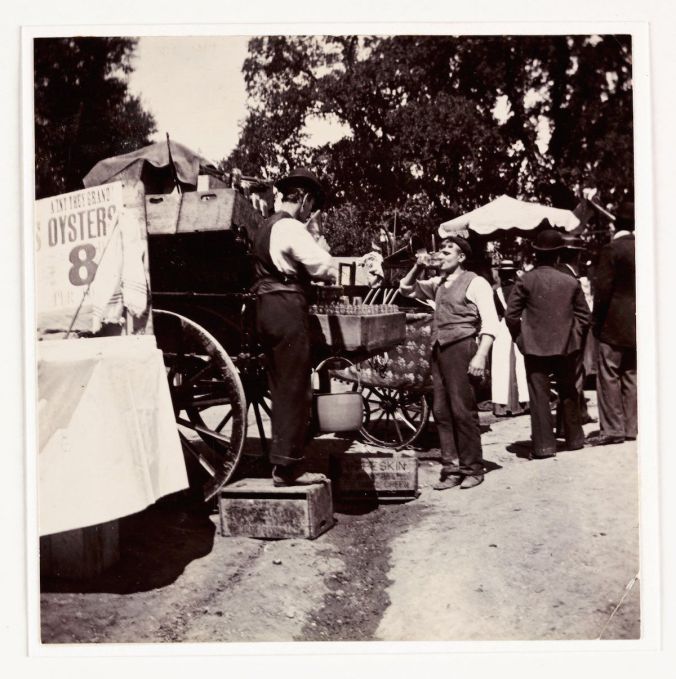 Hampstead Heath, photographed by Paul Martin. A man drinks by a stall, while the vendor looks on. The sign for oysters reads ‘A’int they grand?’ Paul Martin was one of the first photographers to take candid photos of people doing ordinary things