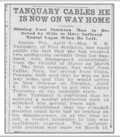 When he moved to Texas, Fort Stockton quickly recognized Judge Tanquary as a state treasure. The El Paso Herald wrote that after just two years, the judge already enjoyed “great popularity and influence” in the Lone Star state.