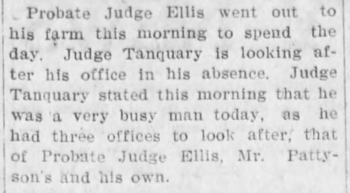 Everything seemed to be going swimmingly for Judge Tanquary… until March 15, 1913. Beware the Ides of March! The judge had gone on a business trip but did not return when expected. His wife Lillian, growing anxious, managed to arrange for a search party to go out and find her husband. Unfortunately, the posse didn’t find Nathan Q…. and what they did find made things look bad for the judge.