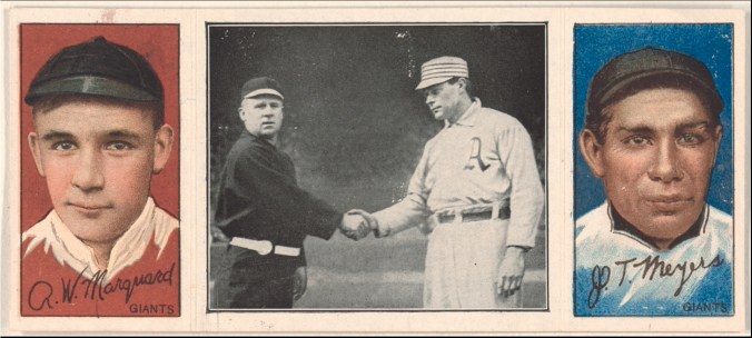 This was the first dual baseball card I ever saw. Richard Marquard (L) and John T. Meyers (R) played for the New York Giants – the same team though both the illustration and the picture create the impression they were on different teams. I’m puzzled about the picture in the middle: is this the real Marquard and Meyers? If so, the American Tobacco Company probably should have invested in a better illustrator. But it seems just as likely the picture is of different people – the men are wearing different uniforms and the fellow on the right is wearing what looks a little like an Oakland A’s jersey.