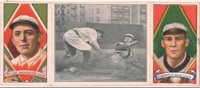 Another example of the dual baseball card! This one tracks with the first – Clyde Milan (L) and N. Elberfield (R) were on the Washington Nationals team in 1912 – but the illustrations show them in different uniforms. The picture in the middle is even more curious than the Marquad/Meyers card. This definitely doesn’t look like two players on one team, though the guy sliding in on the right does look like the illustration on the right.