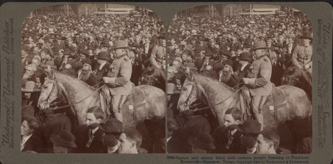 In 1905, President Theodore Roosevelt went on a trip west, and he stopped in Sherman, Texas. This stereoscope image shows him speaking (from his horse!) to a sizable crowd.