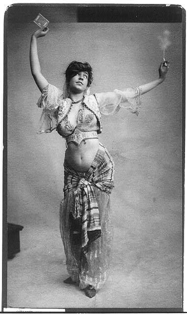 Woman in belly-dancing costume smoking and holding package of cigarettes, 1900. Another example of the fascination with all things eastern. In 1900, the cigarettes and clothing would have been considered to be far too much for polite society.