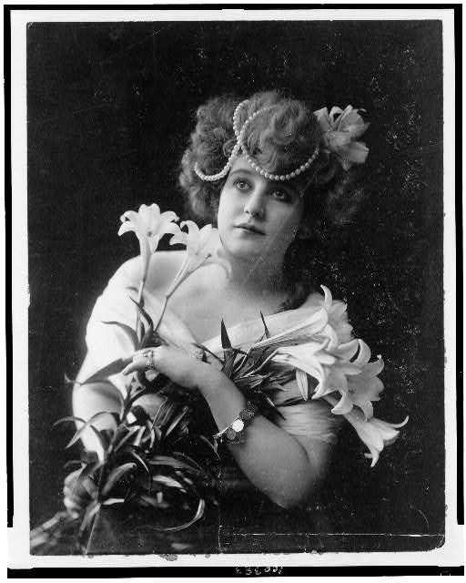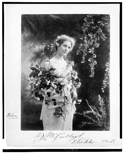 Woman, “Flora,” posing in studio, three-quarter length, standing, facing right, holding flowers by E.J. McCullagh, circa 1900