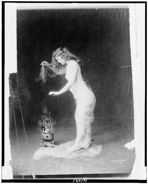 Woman draped in sheer fabric, standing, full-length, facing left, holding up her hair over heating vessel, 1908. This picture and the next were in all likelihood meant to be.an American, more straight-laced version of French postcards. I’d like to know more about the heating vessel and if this was a common way for women to dry their hair.