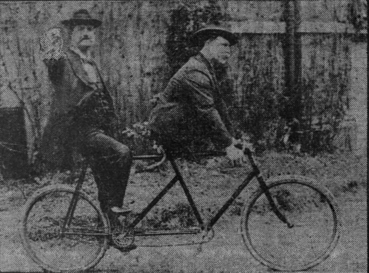 Charles Trippe (left) and Eli Bowen (right) on a tandem bicycle. Charles has an animal perched on his shoulder. Maybe a kitten?