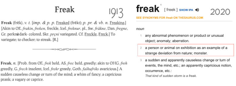 The circus has declined in popularity in recent decades, for many reasons. There are more practical opportunities for people to learn about the world and see new things. Organizations like the Elephant Sanctuary and the Big Cat Rescue have shone a light on the horrors of animal abuse in circuses. Most circuses wouldn’t mistreat an animal, but the evil actions of a few stigmatized the industry. And, labeling a human being as a circus freak sounds cruel and dehumanizing. If you compare the definition of the word “freak” from a 1913 dictionary to the 2020 dictionary, you’ll see an exclusively negative moral judgment has been added.