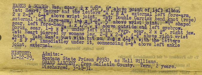 We’ll start with Mr. Hall Williams, the less prolific of the two. Officially, the dark-haired, blue-eyed young man did dry-cleaning work for a living, but what Hall really enjoyed was stealing cars in Montana. Unfortunately for him, he wasn’t very good at it. Between 1929 and 1937, he was arrested at least three times for grand larceny.