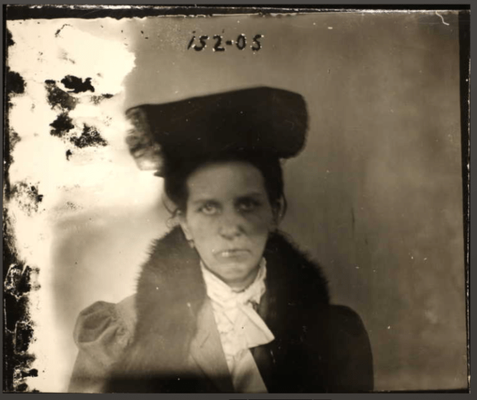 Of all the mugshots, only two were of women. Neither was photographed in stripes, and I wondered if they were really prisoners and not a spouse or an employee, but they had numbers so they must’ve been. And Maggie Snyder, featured here, does look like nothing but trouble: