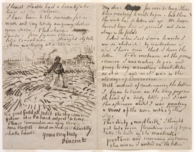 A. Vincent Van Gogh – This one was tricky! The Dutch painter wrote this letter in English. I know very little about Van Gogh’s life beyond the story of him cutting off his ear and giving it to a prostitute and later committing suicide. Overall, he appears to be a clear, quick thinker. It’s interesting that in this letter, you can see three distinct styles. The handwriting over the picture is amiable and sanguine. It was written quickly. It’s the most light-hearted of the three styles.