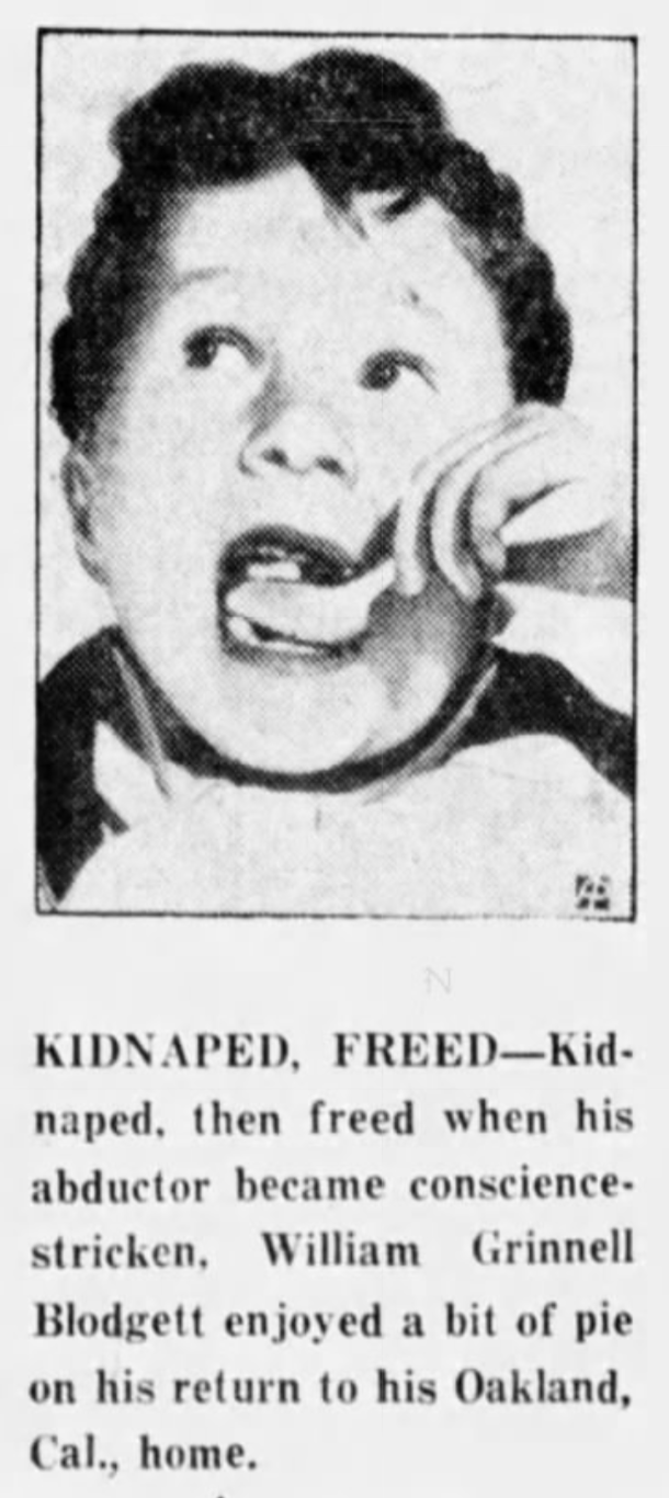 In April 1937, Mr. and Mrs. Stewart William Blodgett, were still new to Oakland, California. The couple had moved to California from Saint Paul, Minnesota, with their 5 year old son, William Grinnell Blodgett II. One day, the boy was at a local park with two neighbor children, when he was kidnapped.