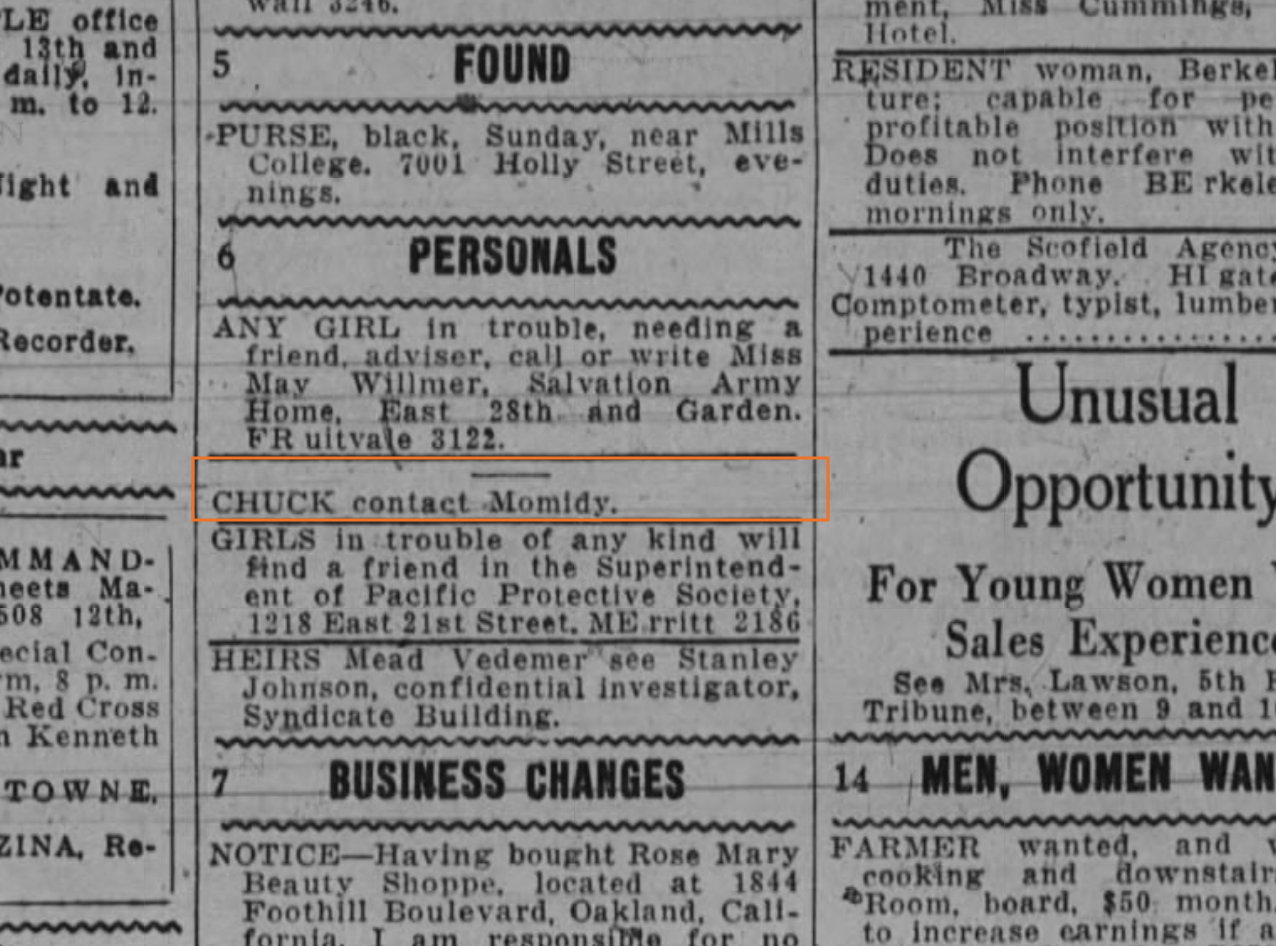 I’m guessing “Chuck” the kidnapper was never found. I looked at the Oakland Tribune for the following day, and there was one obscure reference that might be connected.
