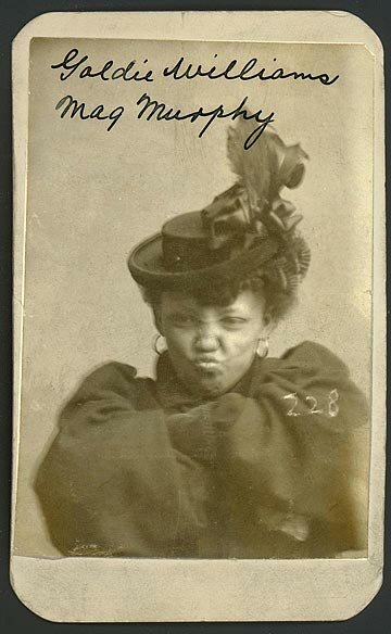 At 5’ tall and 110 pounds, Goldie Williams, alias Meg Murphy, was a petite woman. When Omaha Police took her mugshot in 1898, she said she lived in Chicago and gave her occupation as a prostitute. Williams sports an elaborate hat with satin ribbons and feathers. I couldn’t find what she was picked up for.