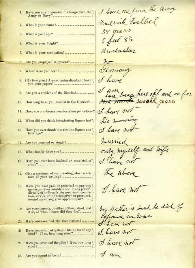 Imagine it’s 1888, and you work at the DC Metropolitan Police Force. You are in charge of hiring, and this handwritten application by a man called Frederick Voelbel lands on your desk.