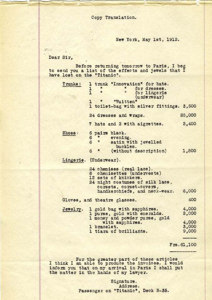 I recently came across some claimant forms for the Titanic in the National Archives. This is the paperwork Titanic survivors filed to be recompensed for their property that went down with the ship. Have you ever wondered what is lying down there, on the ocean floor?
