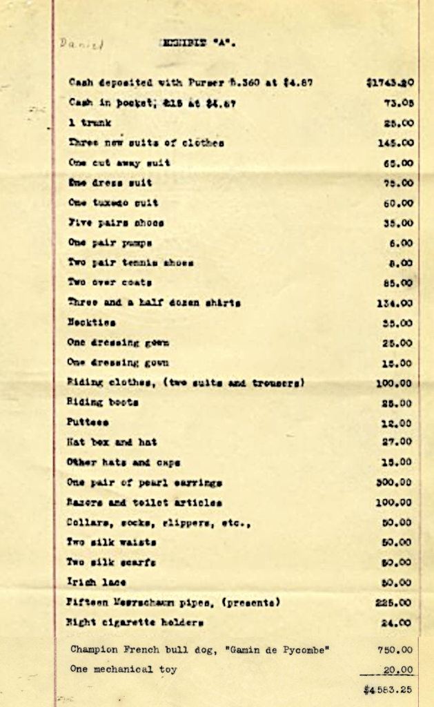 Mr. Daniel seemed to be carrying a lot of money: he had money in his pocket, money held in safekeeping with the ship’s purser, and some very expensive clothing, shoes, and a French bull dog, all of which added up to $4,583 (2021 equivalent: $128,987).