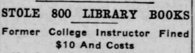 Professor Orville Marsh had stolen 800 library books from cities as far away as St. Louis, Chicago, and Toledo. Marsh’s criminality was not suspected by Akron University, nor Cleveland College, where he taught business administration for six years. No one had cause to suspect Marsh of this level of depravity. The 52-year-old had a deceptively innocent appearance, and he was an educated man. He had gotten his undergrad from Harvard and his master’s degree from University of Chicago.