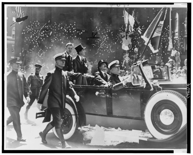 Charles Lindbergh rode up lower Broadway in an open car next to Mayor James J. Walker, Grover Whalen is in front of the Mayor 1927 (LOC)