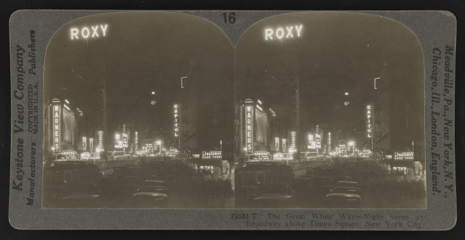 Stereoscope of The Great White Way — night scene on Broadway above Times Square, New York City Keystone View Company 1920s (LOC)