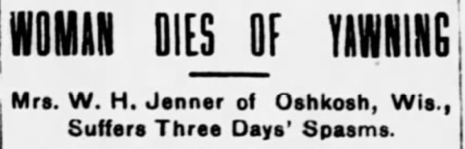After yawning without interruption for three days, despite every effort to effect a cessation, Mrs. William Henry Jenner died. The physicians in attendance stated that the woman was suffering from obscure lesions of the brain, producing laryngial spasms.