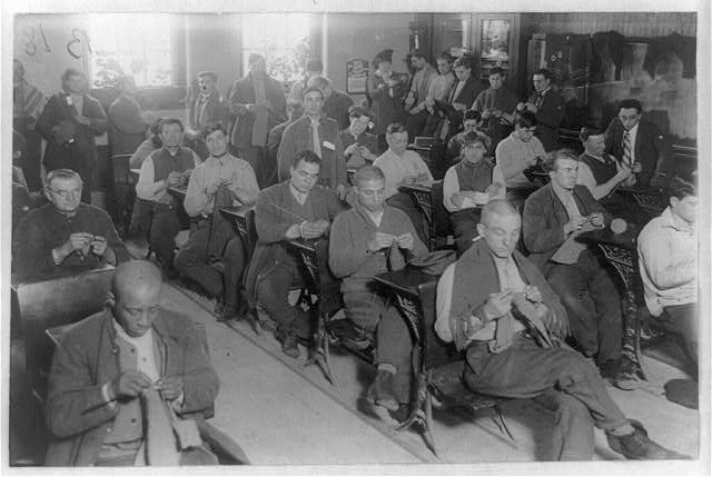 Prisoners knitting in one of their classrooms, Sing Sing, circa 1915. (LOC)