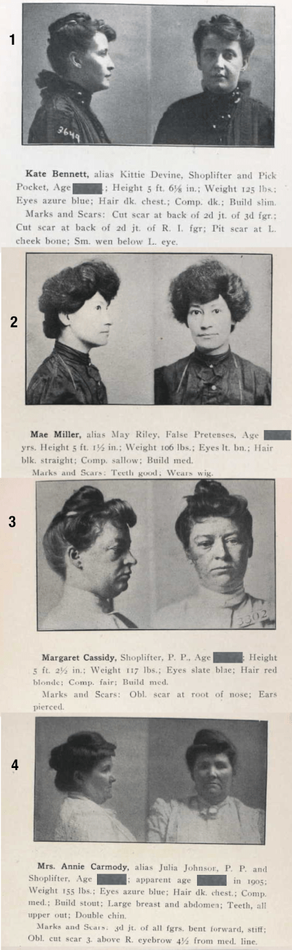 There were a few ladies in the Album of Criminals and their mugshots and descriptions are especially interesting. Apparently, they could tell the police any age they wanted, and the police had to take their word for it. Were they living hard or lying?