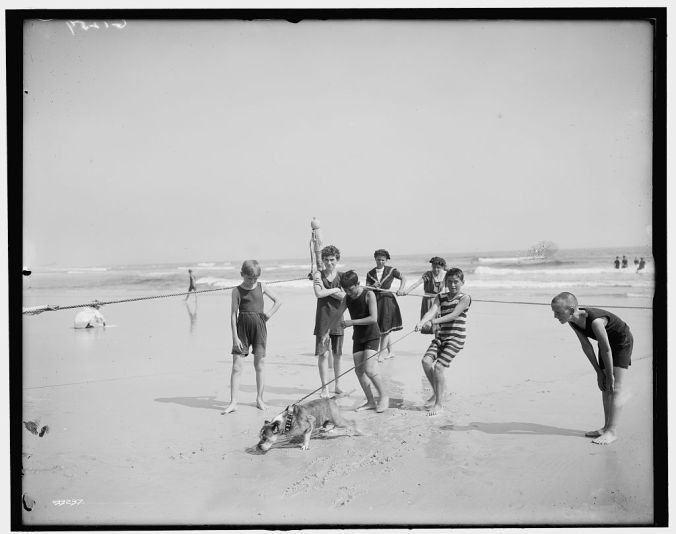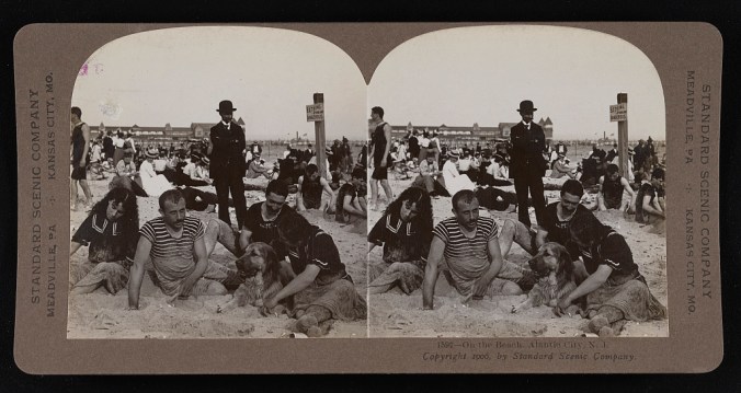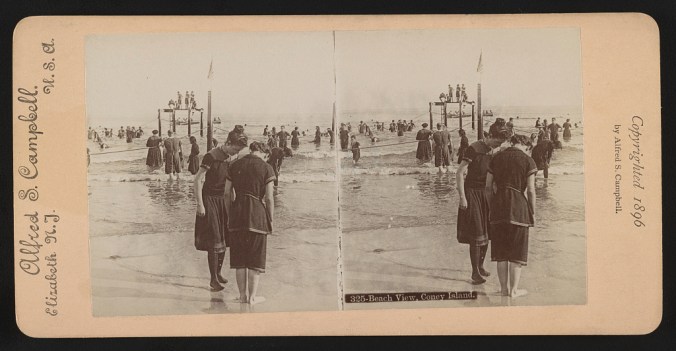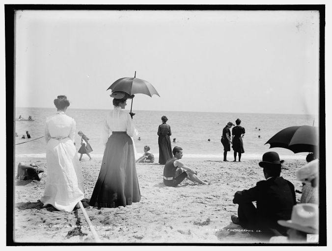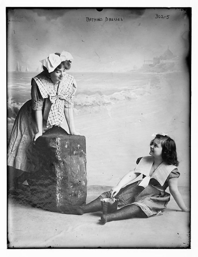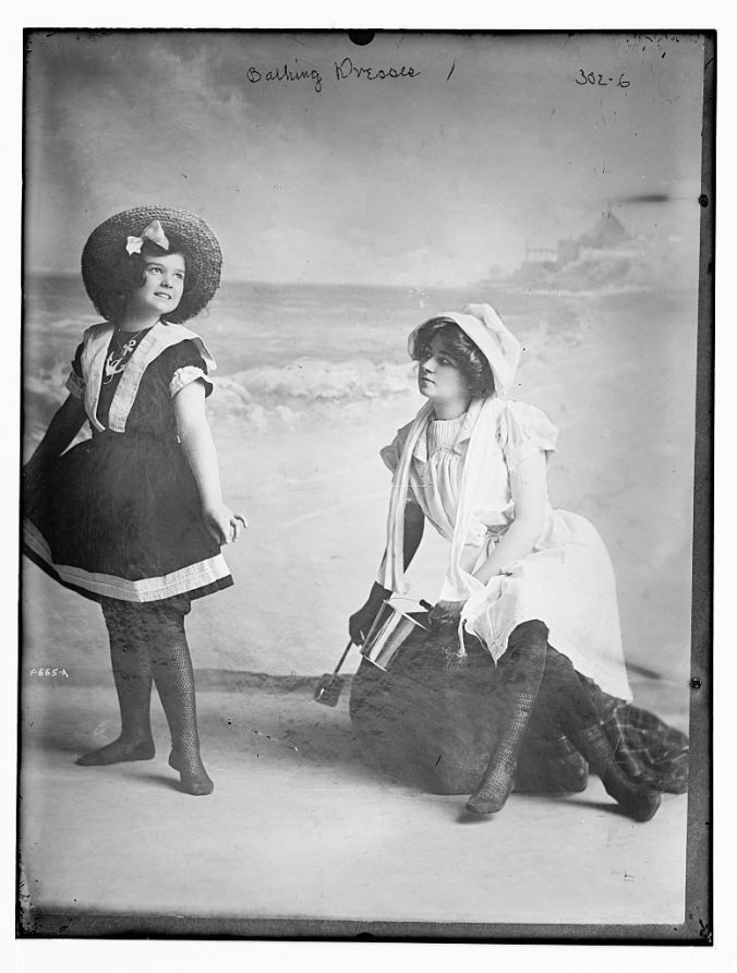 Oh GOSH! I get the the benefits of modest bathing suits, but not even being able to have your legs and feet out, no thank you! As one who has many (and I mean MANY) stories of going topless on European beaches, I do not like the fact that this would have been so very uncomfortable indeed. Not that women’s clothing was in general comfortable but this time period is when things really start to change ca. 1910. I’m sure bathing suits got smaller once clothes did too in the 1920s. I couldn’t wear wool anything let alone tights as part of a bathing suit in August.