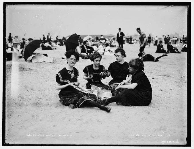 four young women wearing bathing suits sitting on sand mound at the beach. 1906. I bet the women in the background disapprove of the girls. “You can see their elbows! Shameless!”