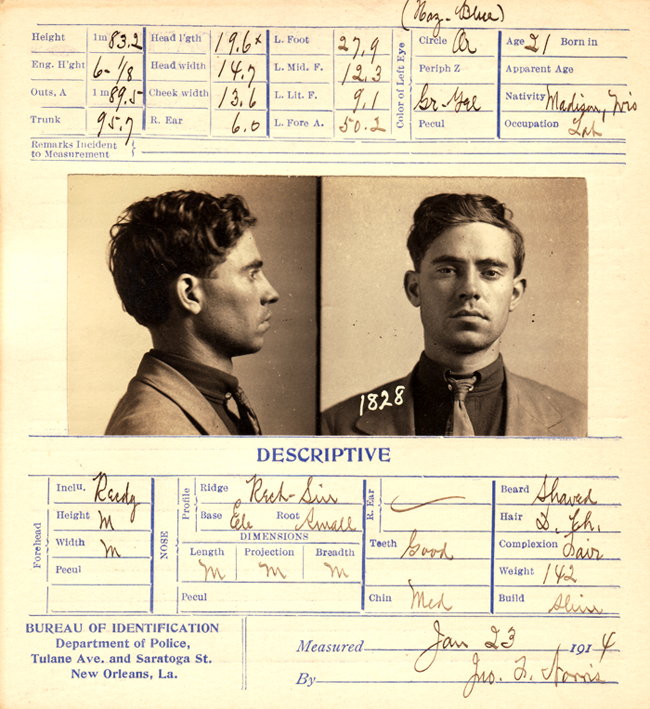 Adolph Hellquist, 28 yrs, was a waiter in New Orleans in Sept 1912 when he was arrested for being a suspicious person. Record notes he has a tattoo of a naked woman on his right forearm!