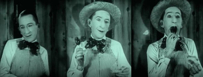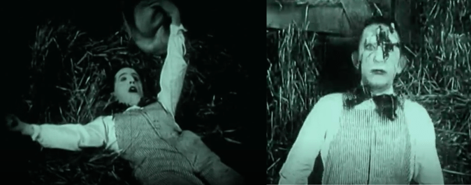 Scene 2 begins with one of the creepiest characters ever to appear on film. He is just waking up in Uncle Henry’s barn—a trespasser. Maybe the worst thing about him is the huge floppy bow around his neck.