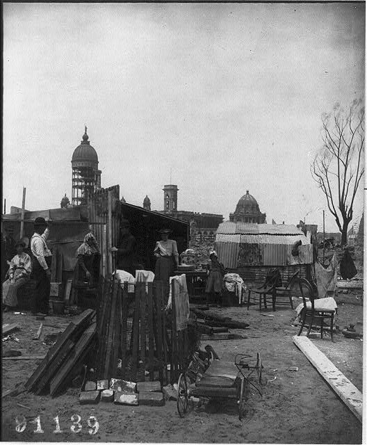 San Francisco Earthquake and Fire- people with temporary living quarters in foreground – ruins in background c1906 May