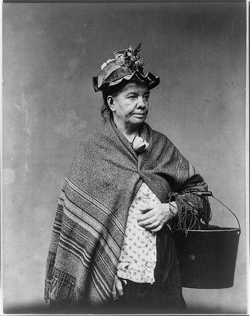 It’s a photograph of a woman wearing a hat, with a shawl that has a flower tucked under her chin, holding a bucket in the crook of her arm.