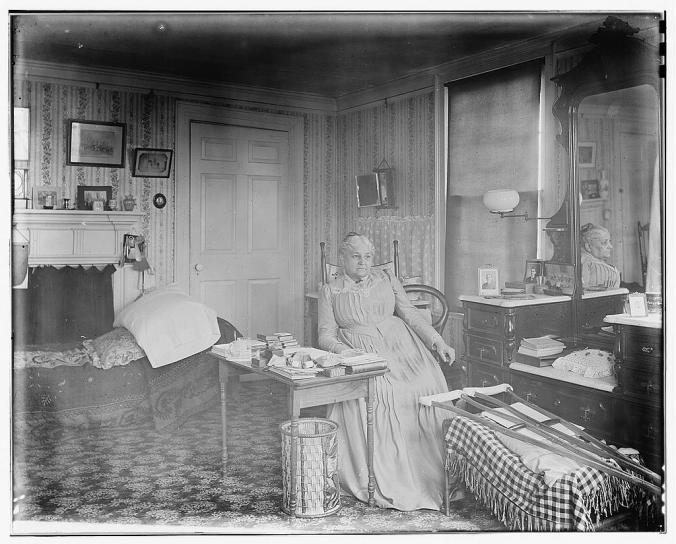 This charming elderly lady was photographed between 1890 – 1900. Was she a mother? She appears to be rather well-off: she is in a large bedroom with carpeting, furniture, and artwork. Her crutches are on the stool in front of her, but it’s impossible to know what injury she had. This photo was taken by Charles Henry Currier.