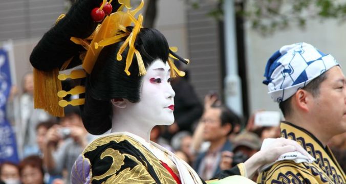 The oiran wore brightly colored kimonos, lots of gold jewelry, and heavy stylized makeup. The ornaments for their hair called kanzashi–and an oiran typically wore more than half a dozen.. The higher the class of the oiran, the more elaborate, heavy, and expensive her attire was! Unlike “common prostitutes”, the oiran were known as refined women who were talented in singing and dancing. And unlike a Geisha, Oiran tended to be flashy. It’s hard to see the flashiness in black and white, so take a look at this modern oiran in a parade.