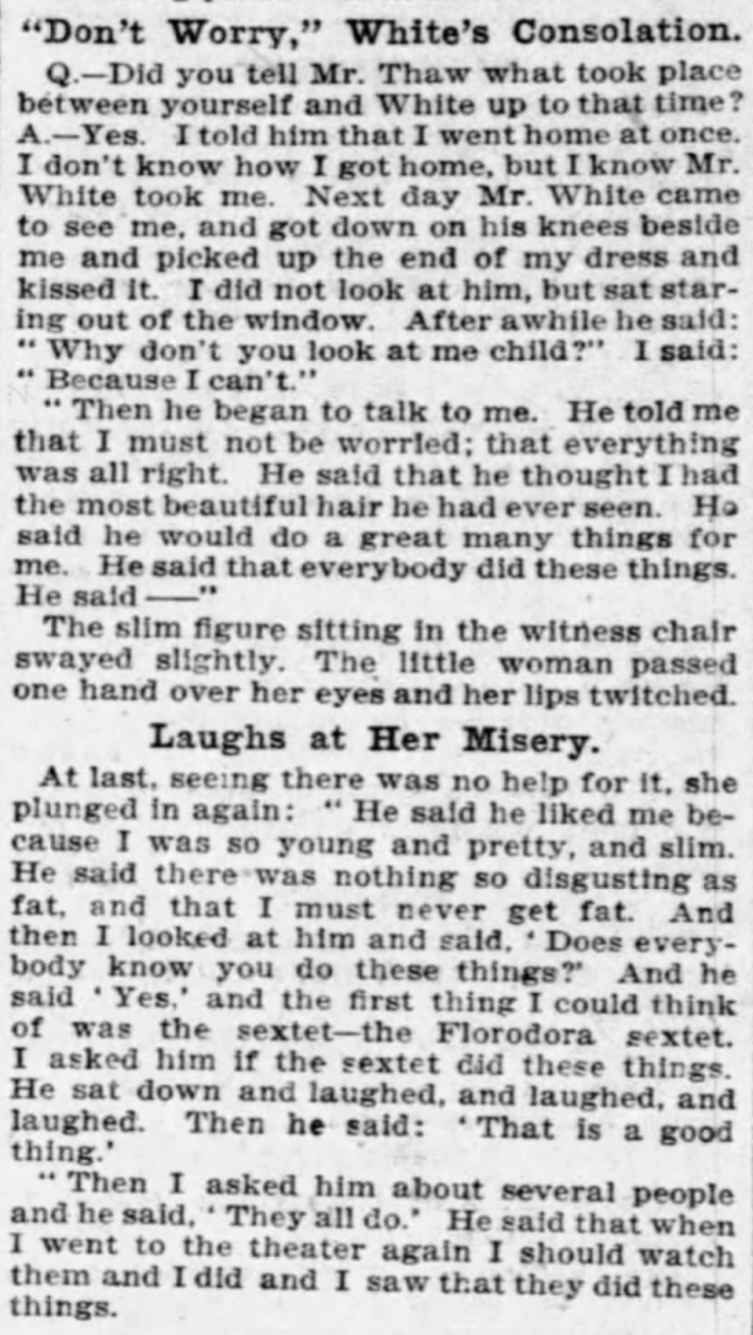 I’m including a small bit of Evelyn’s testimony. Her description of what White said to her the day after he attacked her sounds a lot like a modern story of a certain powerful Hollywood producer.