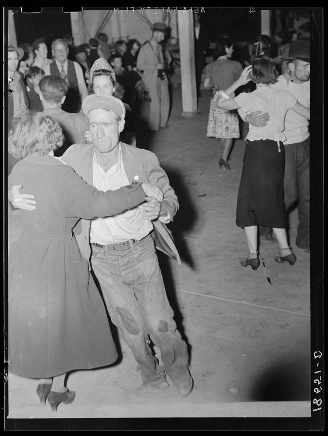 Obviously this was a special occasion: a Halloween dance at the migrant camp. People in these camps had so little–just whatever they could fit in a car or wagon. The ladies’ finery tells us they found a little corner to bring a pretty hat or a pair of high heels with them. Definitely not for every day. Maybe as a tiny symbol of hope their fortunes would change one day?