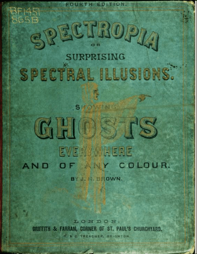 Spectropia is a children’s book of optical illusions. It was very unusual to have a book with color pictures for children in the 1860s so that alone would have been a wonder for the children. It works by staring at the picture on the right for 15-30 seconds, then staring at the blank page opposite.
