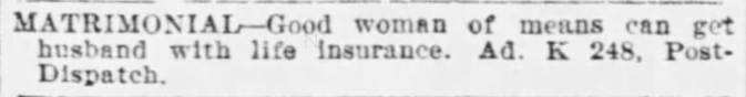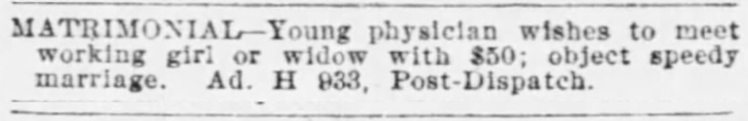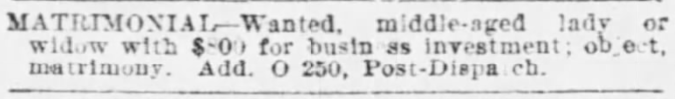 Today I bring you matrimonial ads from four eligible bachelors in St. Louis in 1897 and San Francisco in 1912.