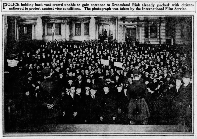 “Without hysteria but with no uncertain voice…the people of San Francisco spoke their desires last night for a cleanup of the city’s nightlife. They spoke in tones of command. They turned out in thousands upon thousands. They filled the great Dreamland Rink to overflowing. The throng would have filled another such rink could the people have been accommodated. They would have filled the great civic auditorium,” the San Francisco Examiner reported. “First they listened. Then they acted. And when they acted it was to tell the city officials that 7,000 representatives of the people demand the enforcement of the moral laws…It was such a throng and such a message as must be heeded by all concerned.”
