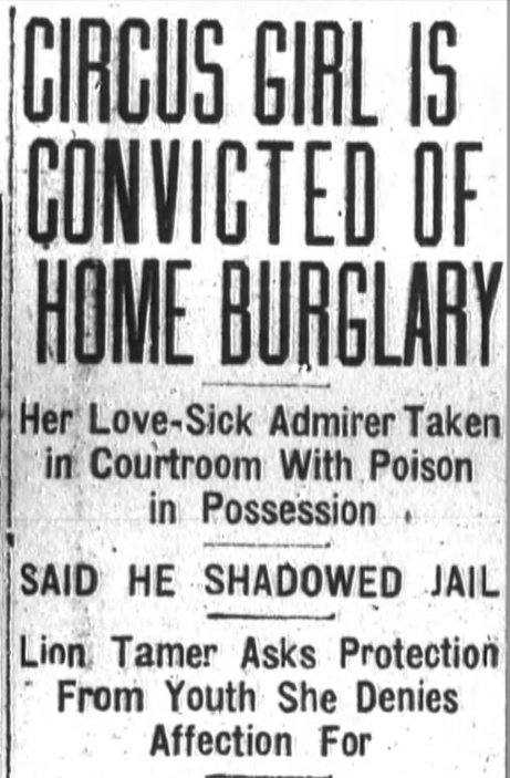 “Irene Johnson, circus rider and lion tamer, was today convicted by a jury of burglary in the first degree,” the Sacramento Bee trumpeted, “and James T. Lafferty, a love-sick youth, was taken into custody in the courtroom having in his possession a bottle of poison and a suicide note telling of his love for the convicted girl.”