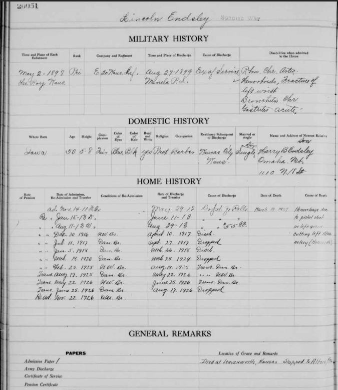 Reader Jax “Saggezza” had an interesting thought to check on Mr. Pierce’s date of death. Though I couldn’t find him, here’s the government record for Mr. Endsley (the newspapers spelled his last name incorrectly). Gives us a few more details about Mr. Endsley. Amongst other things, we can see he was a barber by trade, with dark hair and blue eyes. And Mr. Pierce’s gunshot hit him where it hurt.