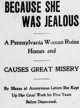 The newspapers speculated that Mrs. Jones would probably be tried for criminal libel, but it never happened. “Mrs. Harriet Jones, of Berwick, the confessed writer of anonymous scurrilous letters, for which she was arrested, has been sent to the State Hospital for the Insane at Danville,” the Altoona Tribune reported on January 18.