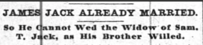 The Chicago Tribune gleefully relayed a conclusion to the mystery: “Later it became known why Sam Jack’s extraordinary request was made. James Jack was in love with a young woman in New York, and Sam Jack knew it. The clause in the will was an attempt to break off the match, but it did not succeed. It has since been reported that Jack has married Miss Queenie Clifford.”