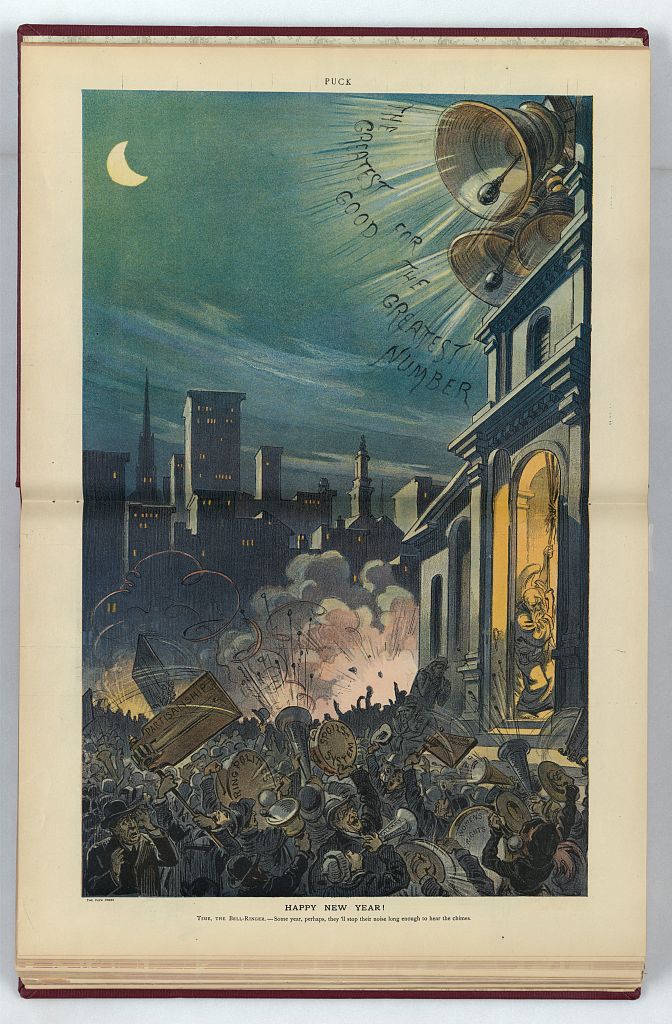 1910 Illustration shows Father Time ringing bells proclaiming “The Greatest Good for the Greatest Number”, while a crowd in the street celebrates the New Year by using noisemakers, horns, drums, and cymbols to sound their personal causes, such as “Partisanship” and “Partisan Politics”, “Ring Politics”, “Spoils System”, “Women’s Rights”, and “Calamity Howling”.