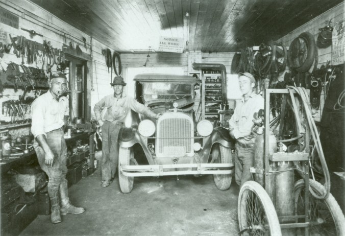 Photograph of William Rhodes, left, who ran The Cycle Shop at 109 East Brown Street in Iron Mountain. Rhodes sold Indian motorcycles and evidently repaired and serviced automobiles. Also pictured are Pat Trepanier, center, and James Martin, right. Information on the photograph indicates The Cycle Store was located at 202 Merritt Avenue.